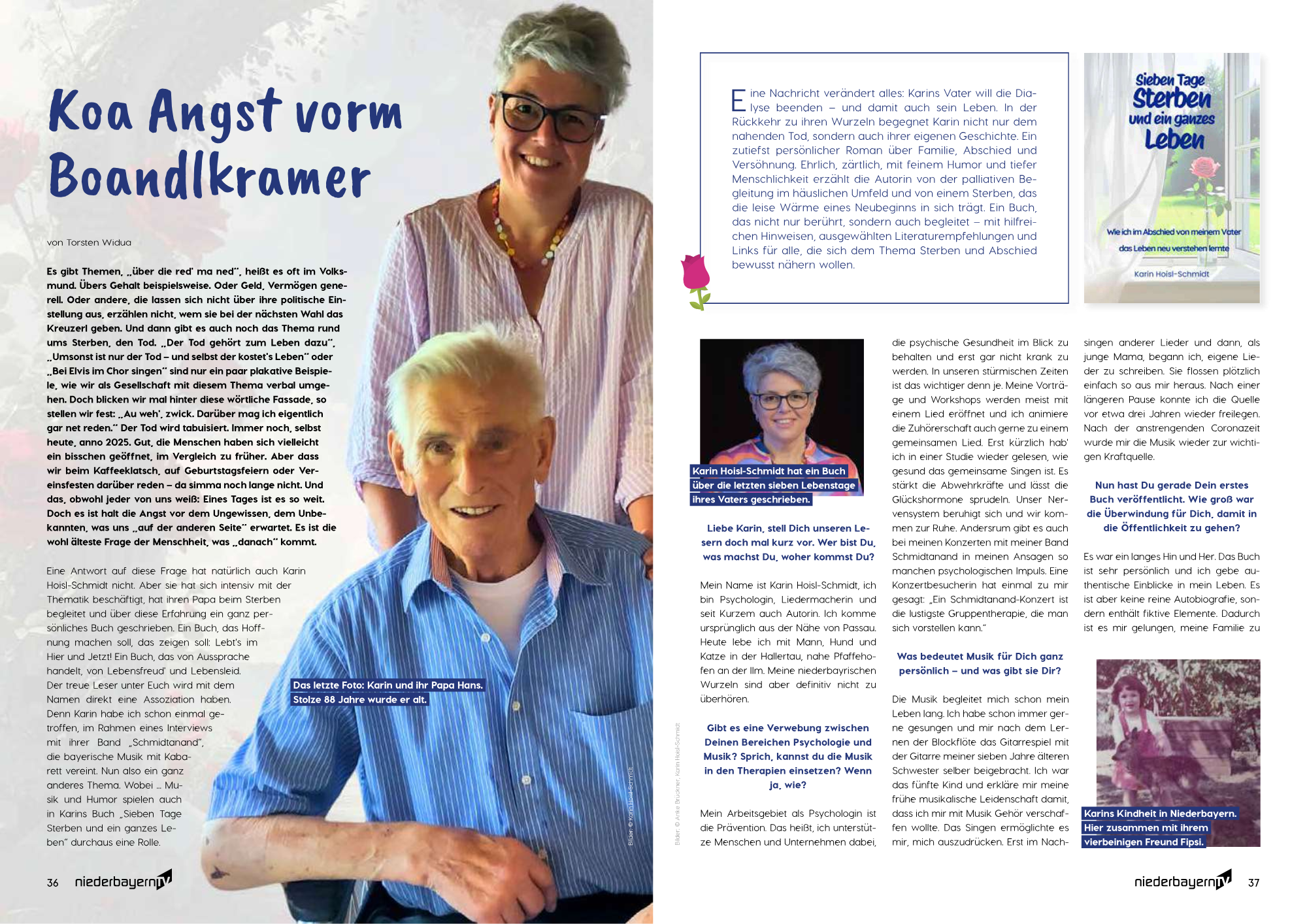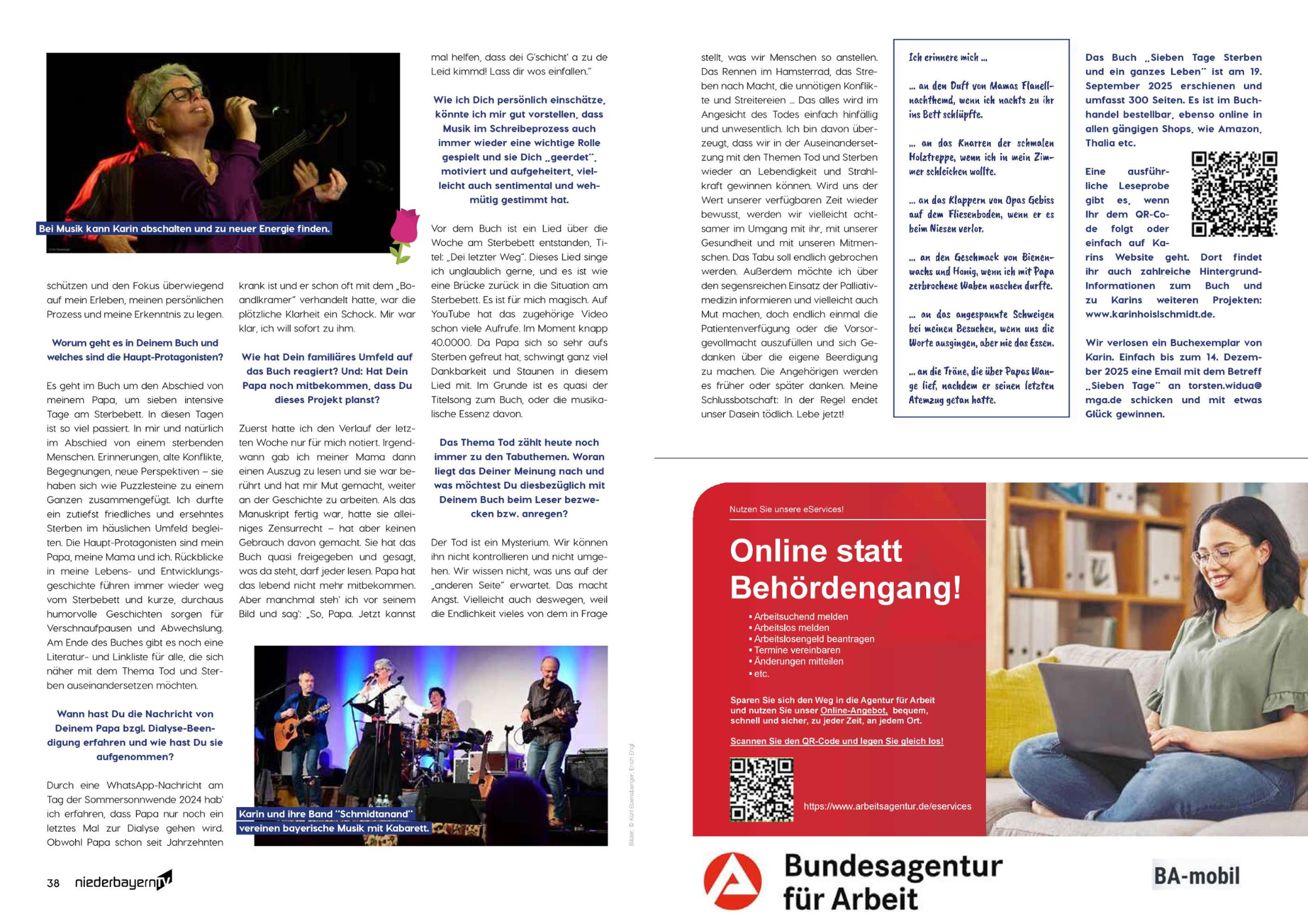 In der Novemberausgabe 2025 vom niederbayernTV-Magazin ist ein Interview zu meinem Buch "Sieben Tage Sterben und ein ganzes Leben erschienen". Redakteur Torsten Widua hat in seinem Beitrag beleuchtet, welche Rolle die Musik in meinem Leben und in meiner Arbeit als Psychologin spielt, wie der Entstehungsprozess meines Buches war und welche Message ich den Leser:innen mit auf den Weg geben möchte.